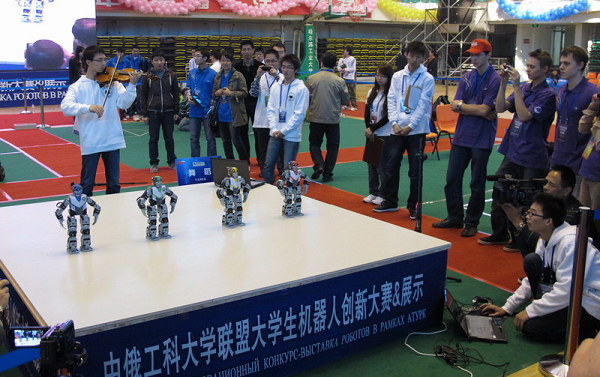 10月12日上午11点,精彩纷呈的机器人多人舞拉开帷幕,我校机器人多人舞表演的主题为《和》,小提琴现场演奏为机器人舞蹈配乐,体现了人机之和;中俄两国特色舞曲的混编,演绎了国际之和;各大高校机器人的同台竞技,展现了校际之和。如此独具特色的表演编排,在众多参赛队的舞蹈中独树一帜,点燃了现场媒体及国际友人的热情之火,得到了其他参赛队员和现场观众的高度赞扬,并取得了此项目第三名的佳绩。