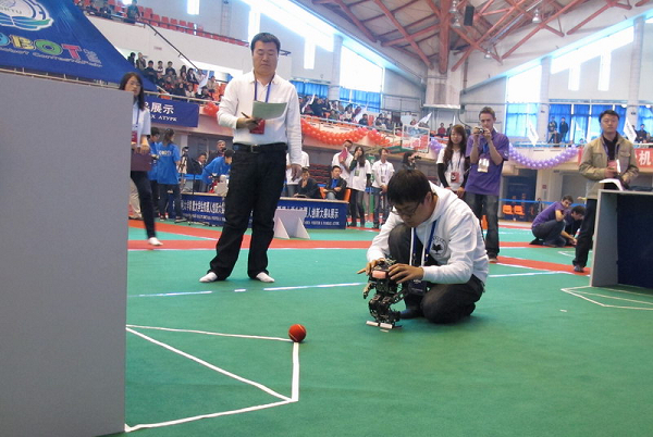 在机器人点球项目中,我校参赛机器人以高超的视觉技术为后盾,眼明脚准,取得了六射四中的好成绩,获得了此项比赛第二名,其极高的精准度得到众多观众的热烈喝彩。