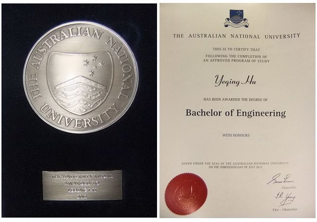 澳大利亚国立大学奖章是一项极高的荣誉,仅授予当年毕业生中极少数的佼佼者,每次获此殊荣者一般全校不足10人。获此殊荣的学生必须获得一等荣誉学士,并且在同届毕业生中取得突出学术成绩。今年7月,澳大利亚国立大学工学院仅有胡野青和郭婧两名同学获得该项荣誉。