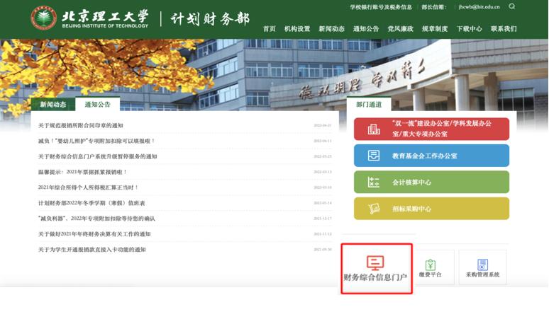 (一)登陆计划财务部“财务综合信息门户”(校园网登陆网址:http://jhcwb.bit.edu.cn;非校园网登陆网址:https://webvpn.bit.edu.cn,登陆后选择计划财务部-主页。)