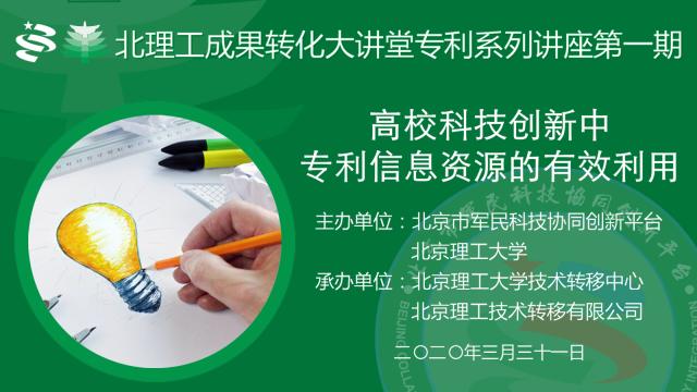 3月31日上午,由北京理工大学技术转移中心策划、依托北京市军民科技协同创新平台实施的北理工“成果转化大讲堂”——专利系列讲座正式开讲。首场讲座通过线上平台举行,以“高校科技创新中专利信息资源的有效利用”为主题,邀请曾负责知名上市公司知识产权管理工作的资深知识产权专家周同担任主讲。来自校内外的300多位科技工作者参加了活动。