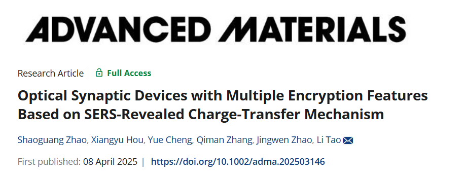 近日,北京理工大学物理学院姚裕贵教授团队成员陶立教授课题组在Advanced Materials发表了一项重要研究成果,题为“Optical synaptic devices with multiple encryption features based on SERS-revealed charge-transfer mechanism”。具有原子级厚度的二维材料光学突触器件表现出构建高度集成的可调谐人工视觉神经网络的潜力。然而,原子级厚度也会导致光吸收较弱,限制了器件的光电性能。该研究提出的罗丹明6G染料(R6G)/InSe杂化结构器件展现了优异的光响应及光电突触性质,并从光谱学和光电子器件两种视角,证明了染料分子和二维InSe之间的电荷转移机制。通过表面处理有效调控了电荷转移的过程,并基于此实现了双重光学加密防伪应用。