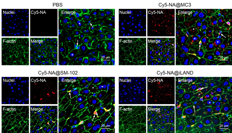 图3 iLAND通过主动靶向肝实质细胞在肝脏积累。星号代表肝实质细胞,箭头代表非实质细胞(包括Kupffer细胞、星状细胞等)