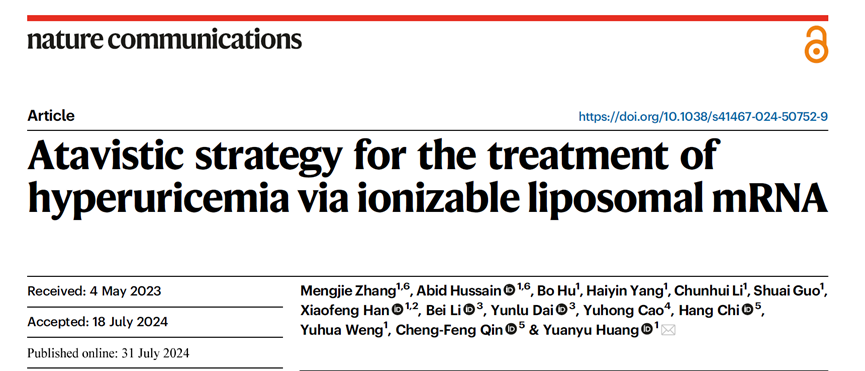 论文详情:Mengjie Zhang#, Abid Hussain#, Bo Hu, Haiyin Yang, Chunhui Li, Shuai Guo, Xiaofeng Han, Bei Li, Yunlu Dai, Yuhong Cao, Hang Chi, Yuhua Weng, Cheng-Feng Qin, Yuanyu Huang*. Atavistic strategy for the treatment of hyperuricemia via ionizable liposomal mRNA. Nat Commun 2024;15: 6463.