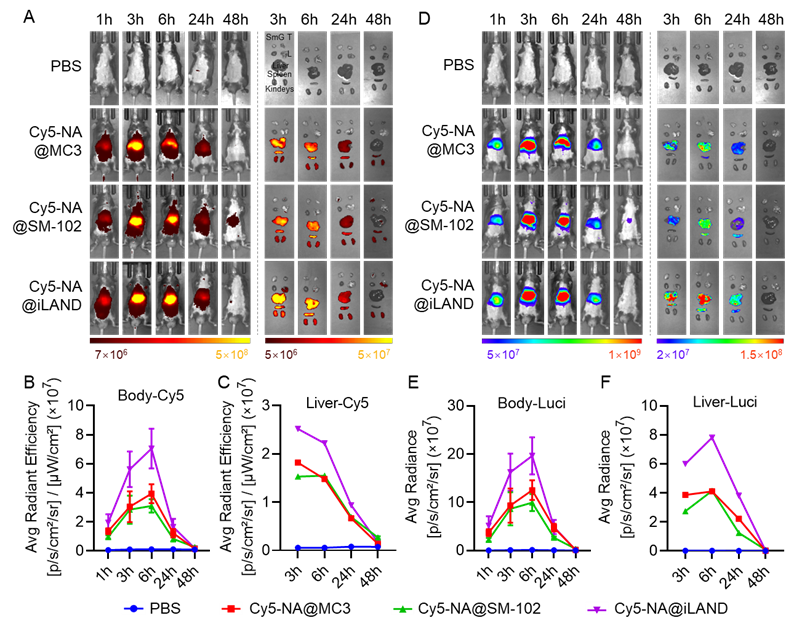 该论文作者基于前期自主研发的可电离脂质分子A1-D1-5( Huang Y*, et al. Sci Adv. 2022; PCT/CN2021/094937 )设计和制备了一种高效递送mRNA(mUox)并表达尿酸酶的脂质纳米颗粒体系(mUox@iLAND)。首先,体内mRNA表达及分布实验数据表明,与已上市的可电离核酸递送脂质DLin-MC3-DMA、SM-102的脂质纳米颗粒相比,A1-D1-5脂质纳米颗粒(iLAND)表现出相当甚至更优的核酸递送能力(图2)。