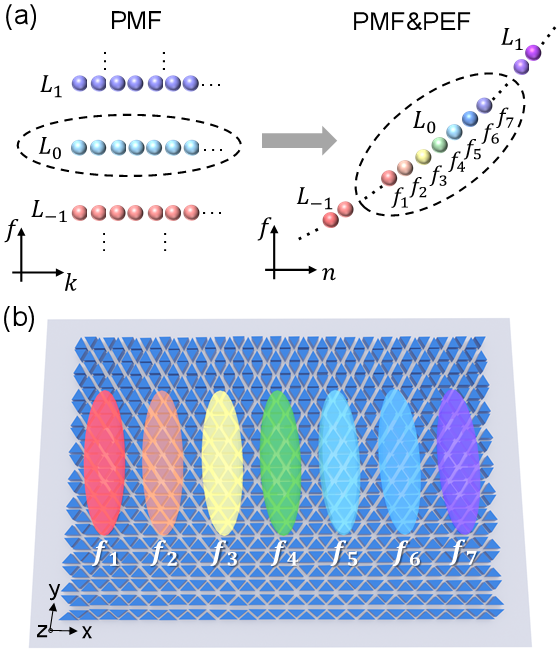 在本工作中,北京理工大学物理学院路翠翠教授课题组和香港大学张霜教授合作,提出同时引入赝磁场(PMF)和赝电场(PEF),其中赝磁场的引入用于产生一系列朗道能级,而赝电场的引入用于打破朗道能级的简并性,在这两种人工规范场的协同作用下,同一朗道能级上的不同频率的朗道模式在空间上分离到不同的位置,呈现出独特的类似彩虹囚禁的效果,他们将发现的这种物理现象命名为“朗道彩虹”。如图1所示。