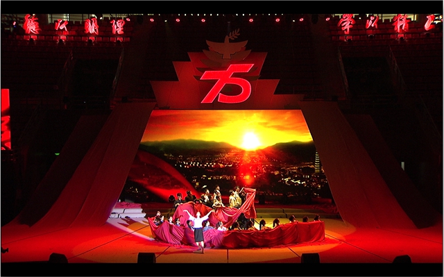 开场视频气势辉煌,在100秒的时间内集中展示了北京理工大学75年来的历史变迁以及突出成就,令在场的观众备受鼓舞。随后在开场舞蹈《中国红 北理梦》的磅礴音乐中,领舞在一位母亲与教师的形象间来回穿梭,象征着北京理工大学如母亲、如教师般立德树人,关爱着一代代的北理工人;舞蹈中一面硕大的红旗不断变换着造型,从巍巍宝塔山到青青延河水,从风吹麦浪到机器轰鸣,从黄土窑洞到教课黑板,一抹中国红象征着北京理工大学的延安根、军工魂!