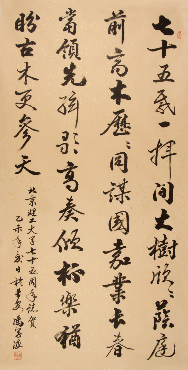 冯老师目前供职于西北兵工局,日常工作繁忙,但他把书法作为一种很好的休息方式。告诉我们要处理好日常生活的五个关系,上班下班的关系、业余与工作的关系、紧张与轻松的关系、左脑与右脑的关系、量变与质变的关系。他教育我们书法一定要给他人带来美感,同时告诫青年学子从传统文化中汲取营养,“可以写不出,但是要懂欣赏书法艺术的美”。采访最后,他为母校75岁生日赋诗一首以表对母校的感恩与祝福:“七十五载一挥间,大树欣欣荫庭前,高木历历同谋国,嘉业长春当领先,絃歌高奏倾杯乐,犹盼古木更参天。”